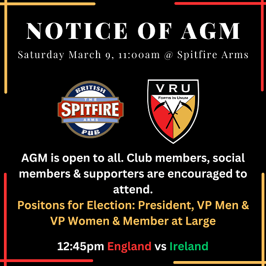 We are pleased to announce that our VRU 2024 Annual General Meeting will take place on March 9, 11:00am at the Spitfire Arms Alehouse (upstairs). The AGM is open to all members of the public and rugby community. Players, coaches, social members, sponsors & parents are welcome to attend. We will recap the year that was as well and highlight changes or action planning for the future. This is your opportunity to have your say and get involved with the club.