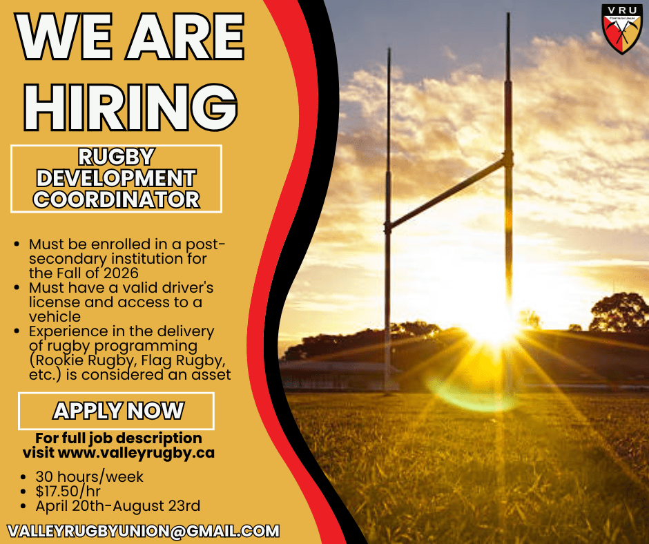 The Rugby Development Coordinator is a summer student leadership position responsible for supporting grassroots rugby participation throughout the Annapolis Valley. The successful candidate will coordinate youth programming, support school initiatives, assist with club operations, and help expand rugby participation through community partnerships and events. The position is guided and supported by the Valley Rugby Union Executive.