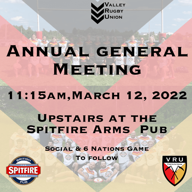 The Valley Rugby Union held its Annual General Meeting March 12th, at the Spitfire Arms Pub, followed by a club social. Reports form the executive highlighted the challenges during Covid-19, and provided an overview of of what was able to happen in 2021 inclusive of indoor touch sessions, multi-sport partnerships, successful minor programming and seniorContinue reading “VRU AGM Recap”